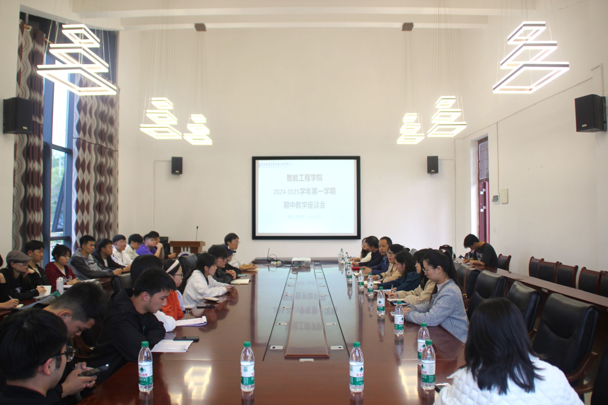 为进一步提高教学质量,加强师生之间的交流与沟通,真实了解、搜集、解决同学们在学习和生活中遇到的困难,倾听学生声音,2024年11月6日下午14时,智能工程学院于梅若书院207会议室举办了2024-2025学年第一学期期中教学座谈会。智能工程学院院长党晓圆、学工副院长祝玮、学工办主任刘桃、教师和辅导员代表及各年级学生代表共30余人参加了此次座谈会,师生代表齐聚一堂、畅所欲言,共同寻找问题、解决问题,筑好、筑牢学生完满成长的基石。