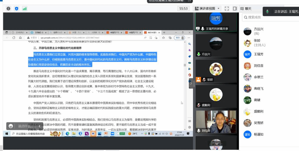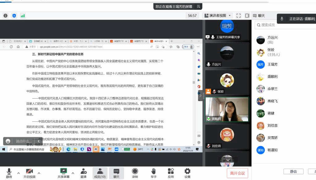 教工支部在11月9日开展线上学习,党员老师们热情分享了自己的学习心得。盛顺利老师分享自己的观点:现在是新时代新征程,我们要紧跟党的步伐,坚持发扬斗争精神,主动地识变、应变、求变,为加快建设教育强国贡献一份自己的力量,立足课堂,突破自我。