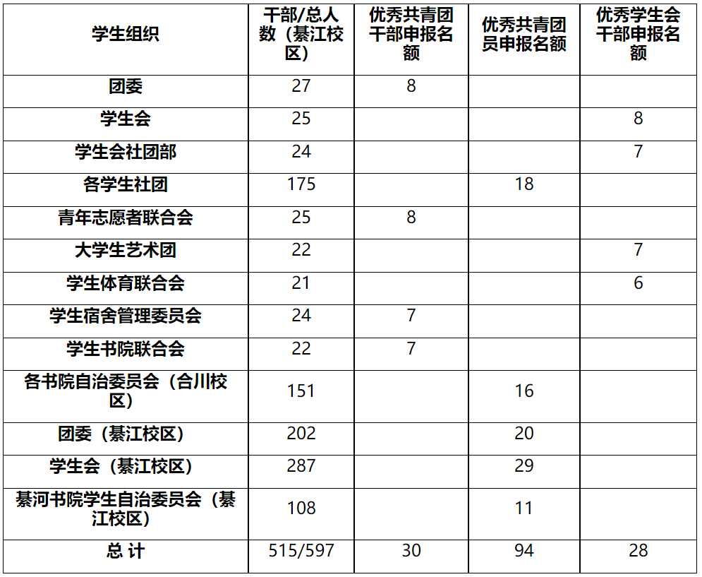按各学院团干部总数的 10%申报;校级学生组织按学生团干部总数的 30%申报;名额不计算在学院申报名额内。