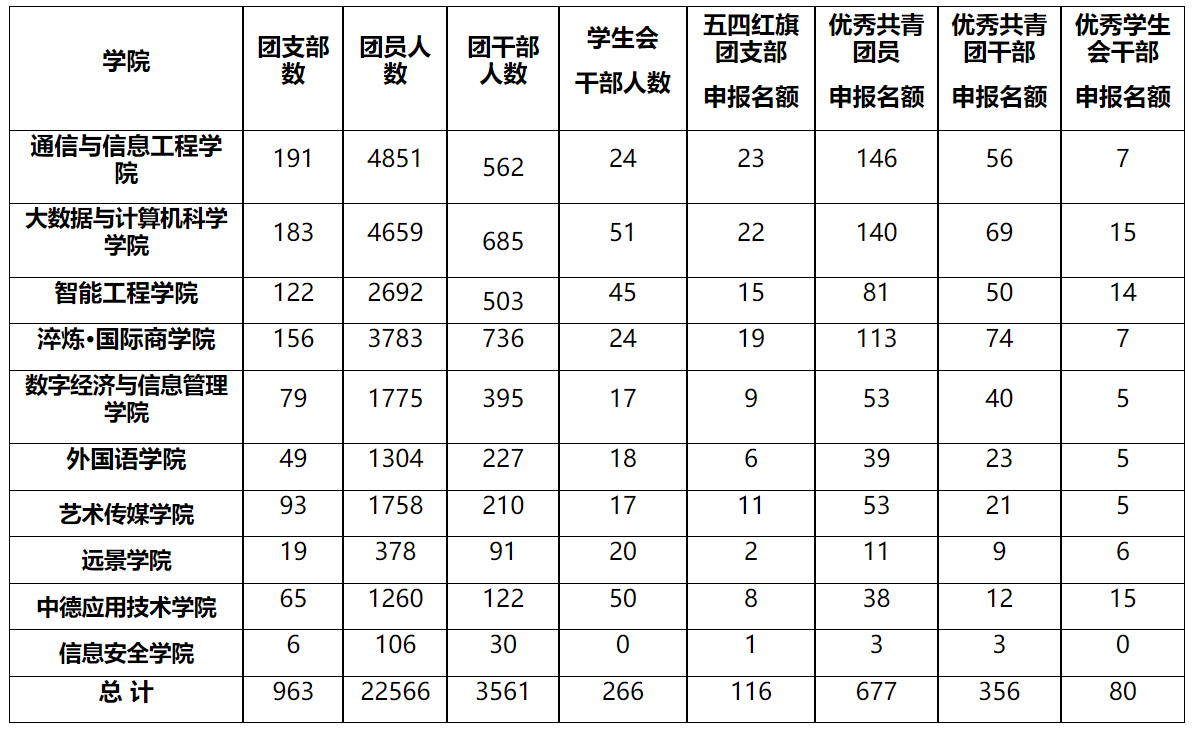 3.学院团总支所属学生书记、组织部、宣传部、实践服务部、调研部、学生科协,等学生干部纳入团干部人数计算;各团支部干部统计限定为团支部书记, 副书记,学习委员,组织委员(或组宣委员),宣传委员,其余干部暂不计入统计范围。