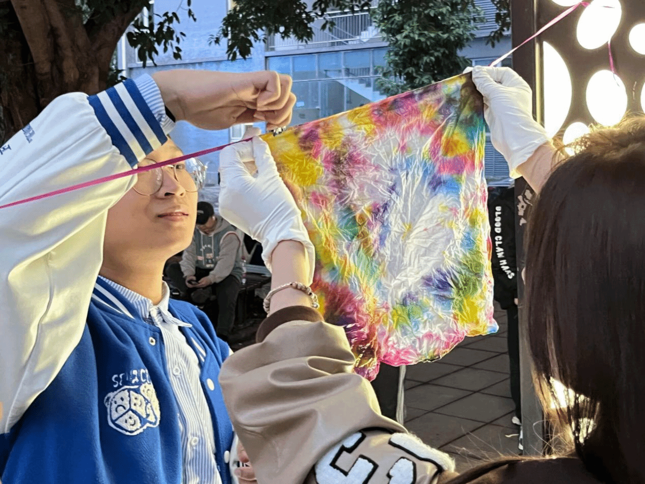 扎染活动结束后,每一组都将自己的作品用工作人员所提供的小夹子固定在彩带上,进行晾干。这一幅幅绚丽多彩的扎染作品无不展现着同学们的想象力与创造力,各位同学在原本平平无奇的白色布帛上留下了属于自己五彩斑斓的颜色,这就如同我们的青春一样,它本就应该是彩色的。