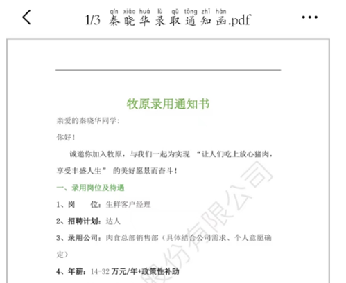 秦晓华,重庆移通学院智能工程学院2020级电气工程及其自动化专业,双体软件精英产业学院第25期项目三部学员,辅导员陈林。现就职于牧原食品股份有限公司,担任生鲜客户经理一职,最高年薪32万。