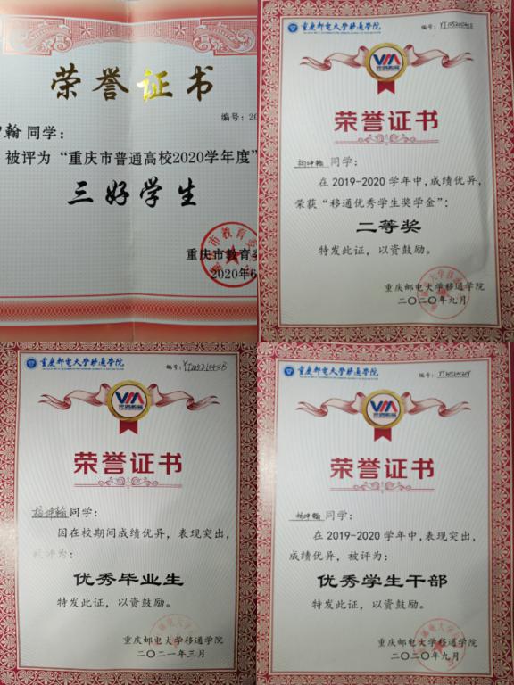 在大学期间,杨坤翰这种坚持、不畏困难的品质,让他一路成长,扬帆起航。2020-2021 学年获得校“优秀毕业生”、校“优秀学生干部” 、校“三好学生” 、校“优秀学生二等奖学金” ,2019-2020 学年获得重庆市普通高校“三好学生” 、校“优秀共青团干部” 、校“优秀学生二等奖学金” 、校“三好学生”,2018-2019学年获得全国”一带一路”调研优秀团队(队长)、校“优秀学生干部”、校“优秀共青团干部”、全国“千校千项”三下乡匠心传播好作品 、校“青年志愿者先进个人” 、校“创新创造优秀能力先进个人”。