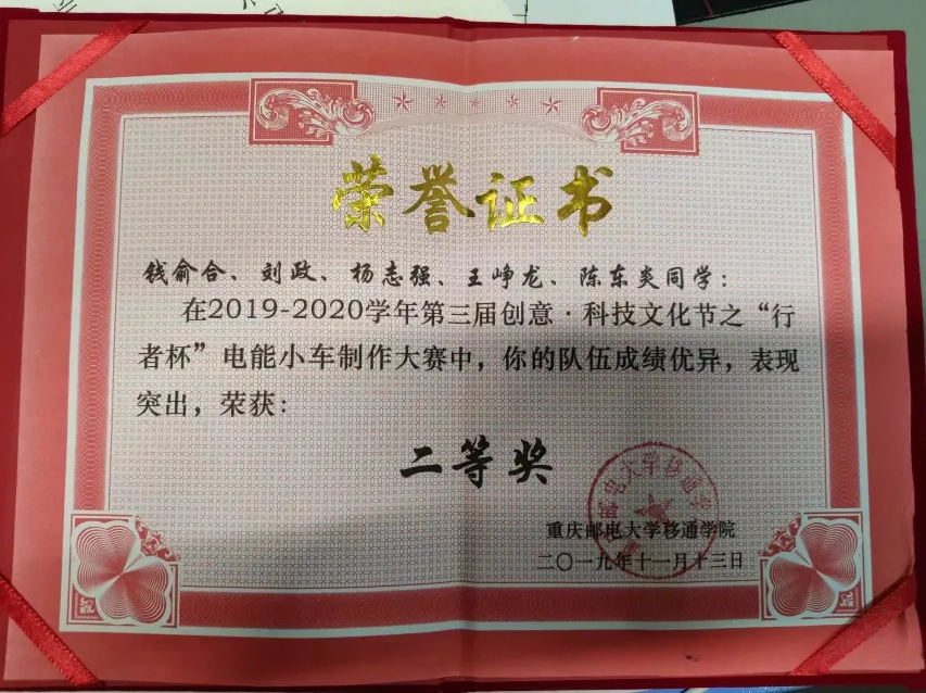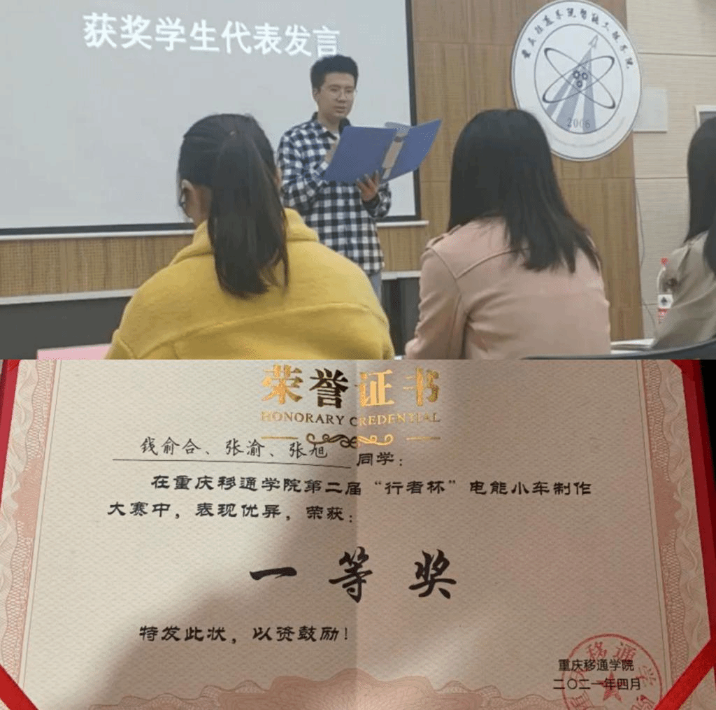 2021年4月,他以丰富的知识和参加第一届“行者杯”电能小车制作大赛的经验,再次参加“行者杯”电能小车制作大赛,最终获得一等奖。同月,随学校其他队伍一起参加第七届全国大学生工程训练综合能力竞赛重庆赛区“智能物流搬运机器人”项目并获得重庆赛区一等奖,也获得了国家级、市级、校级多类奖项。