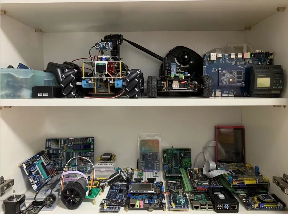 从那以后,他开始自学Altium Designer、KiCAD电子制图软件。从跟着别人的开源项目学习到后来自己设计项目并制作;从只能做别人设计好的电路板到自己设计电路板;从只能焊接直插式的封装到后来做的0603的贴片封装电路板;从只会点个灯到驱使各种各样的传感器和电动机;从只会开环的控制系统到闭环控制系统;从只会用51单片机到Ardunio到STM32,再到树莓派,他一路前行。