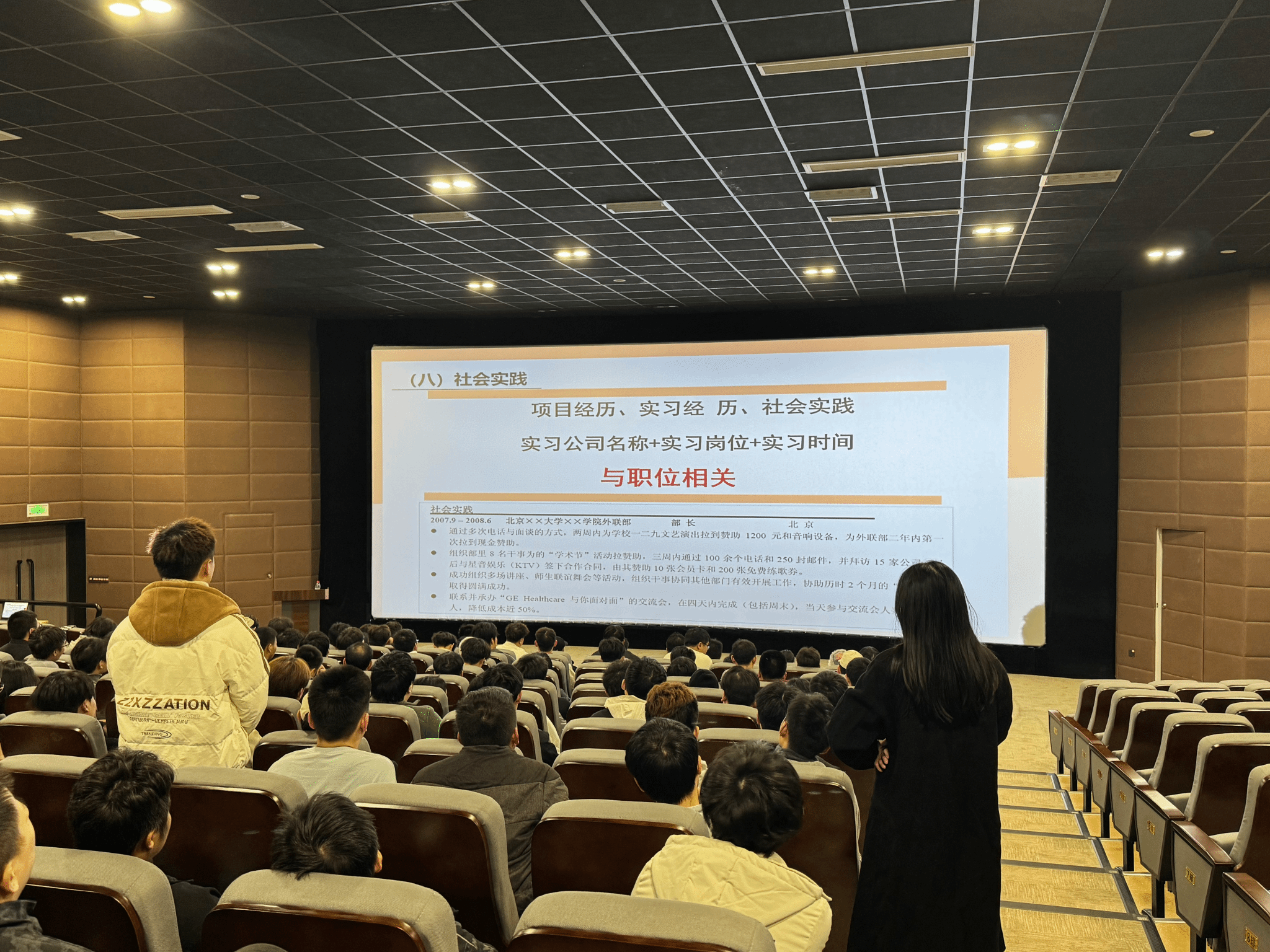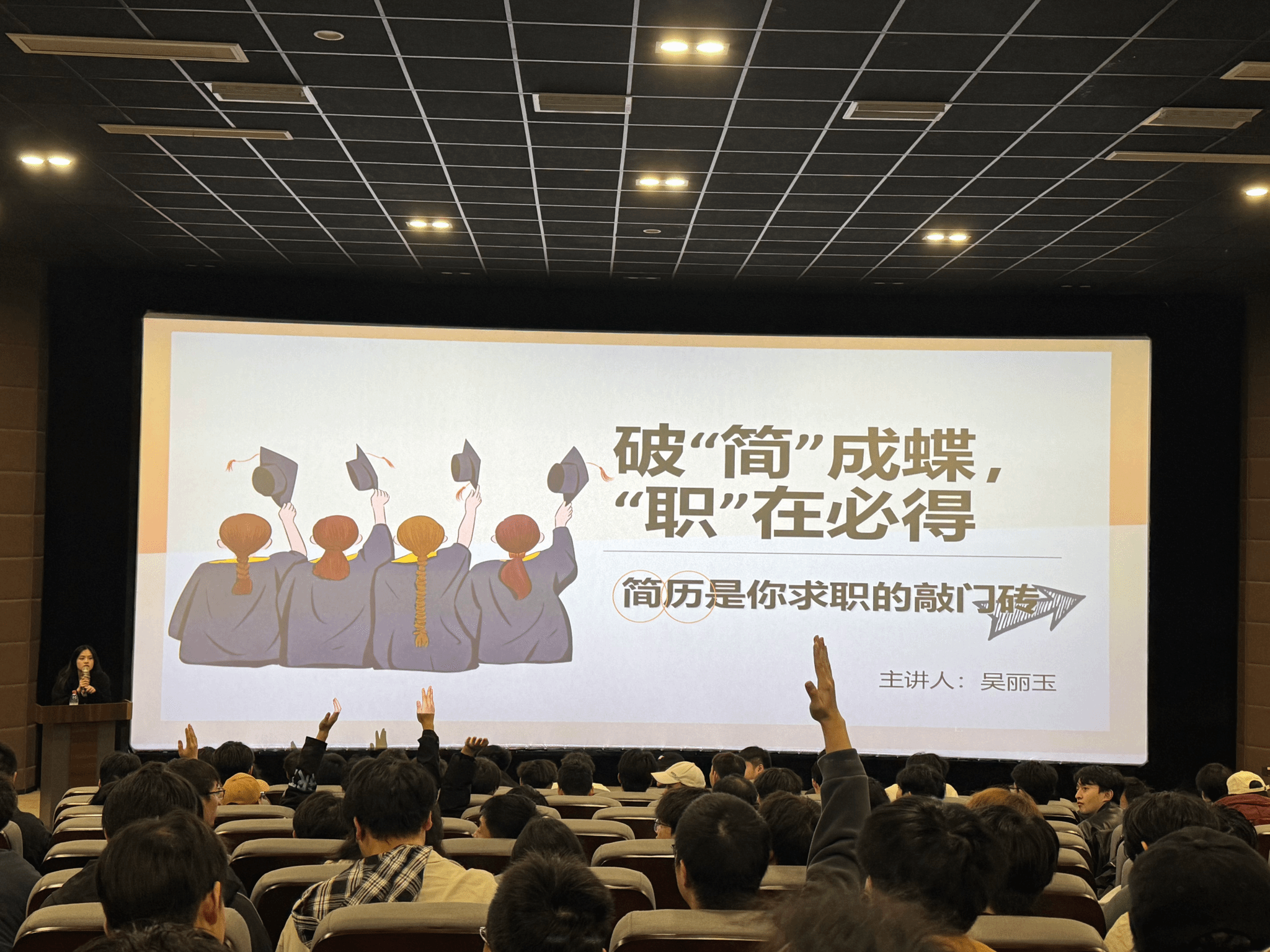 伴随着当今时代职场的激烈竞争,提高就业竞争力成为了广大学生的重要任务,为了更好地帮助同学们明白简历的重要性,提升大家对未来大学生涯的规划性。由就业创业指导与服务中心主办,智能工程学院就业助理团承办的就业沙龙第242期——“破‘简’成蝶,‘职’在必得”于11月20日下午在六度空间开展。此次活动十分荣幸地邀请到了校就业创业导师库成员吴丽玉老师。同时,2024级专升本车辆工程,轨道交通电气与控制,机械设计制造及其自动化,自动化专业150余名同学参与其中。