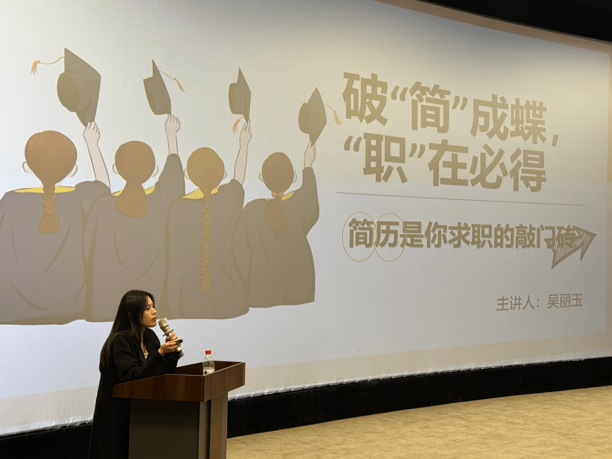 讲座伊始,吴丽玉老师首先通过对同学们进行一系列的提问,来强调了简历对大家的重要性。简历是求职者在应聘过程中的重要材料,是对招聘者进行一个全面而简洁的介绍,从而使招聘者能够快速了解求职者的一些基本情况和一些重要信息。同时吴丽玉老师在分享中强调:“一份好的简历能让我们事半功倍,简历是我们每一个同学们在求职过程中的一份‘职业装’,同时也是我们获得求职机会的‘敲门砖’”。