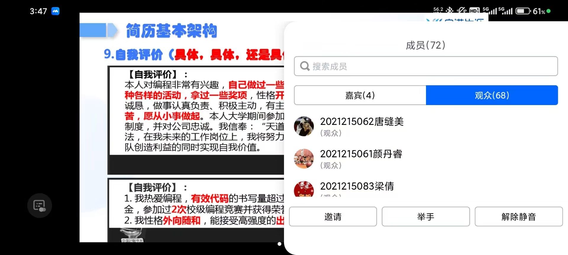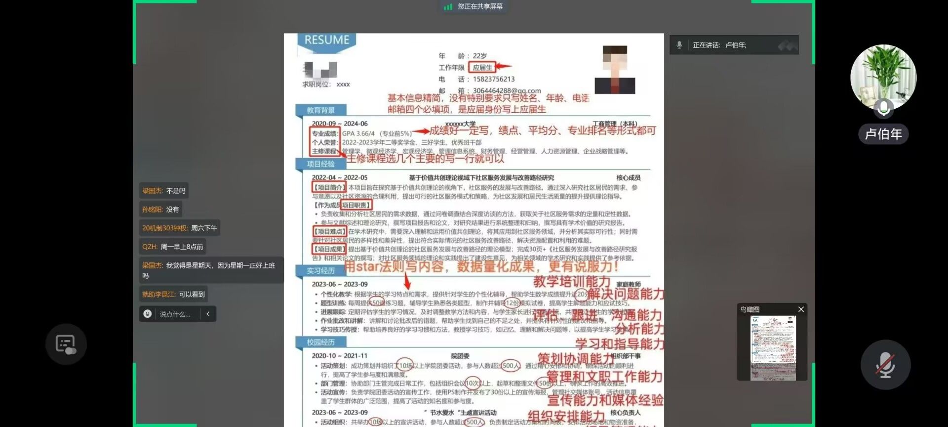 在讲到各板块的注意事项时,卢讲师更是娓娓道来。他提醒同学们,在填写个人信息时要确保准确无误,避免出现错别字或信息缺失的情况;在教育背景部分要突出自己的专业优势和学术成果;在实习经历和项目经验部分要详细描述自己的工作内容和成果,展现自己的实践能力和团队协作精神;在技能特长部分特长要实事求是地列出自己的和技能,避免夸大其词;在自我评价部分要客观真实地评价自己的优缺点,展现自己的自信和谦逊。同学们也积极与老师互动,提出自己的疑惑,为自我提升更进一步。