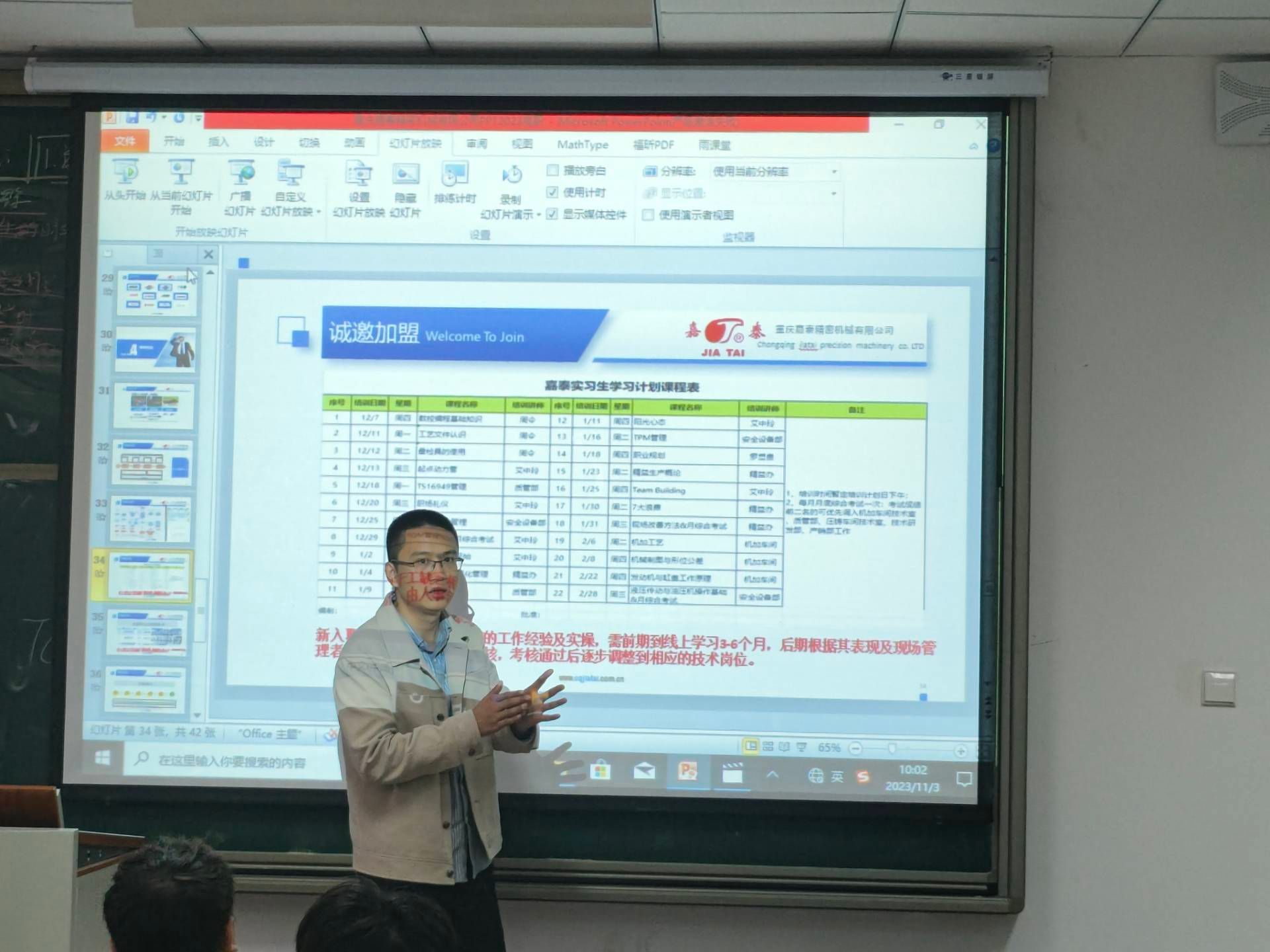为更好地推进学院就业工作,促进2024届毕业生顺利就业,2023年11月3日9:30,智能工程学院引进和重庆嘉泰精密机械有限公司进校宣讲,企业负责人在9201教室举行了宣讲,智能工程学院共20余名2024届毕业生参加了此次宣讲会。