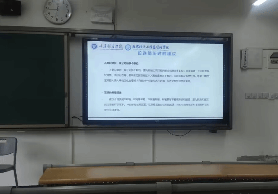 其次,廖阳老师与我们分享了让简历更出彩的关键:“做简历是差异化竞争的体现”,为我们提供了多个写简历模板的网站供学生们查询。廖阳老师说道:简历的关键是求职意向。写工作经验时,老师提出我们要突出背景、写在活动中自我所突出的地方和工作结果。一定要首先撰写与求职意向相符合的工作经验,可以着重展开重要的工作经验,而无关经验可以从简处理。廖阳老师教我们,要想简历更出彩,更能吸引面试官,我们的简历首先要做到格式美观,框架清晰,个人着装整洁,给面试官留下良好的印象,是成功的第一步。同时,我们可以学习一个让自己与众不同,让面试官更能眼前一亮的特长,这可以让对方更能够记住你。