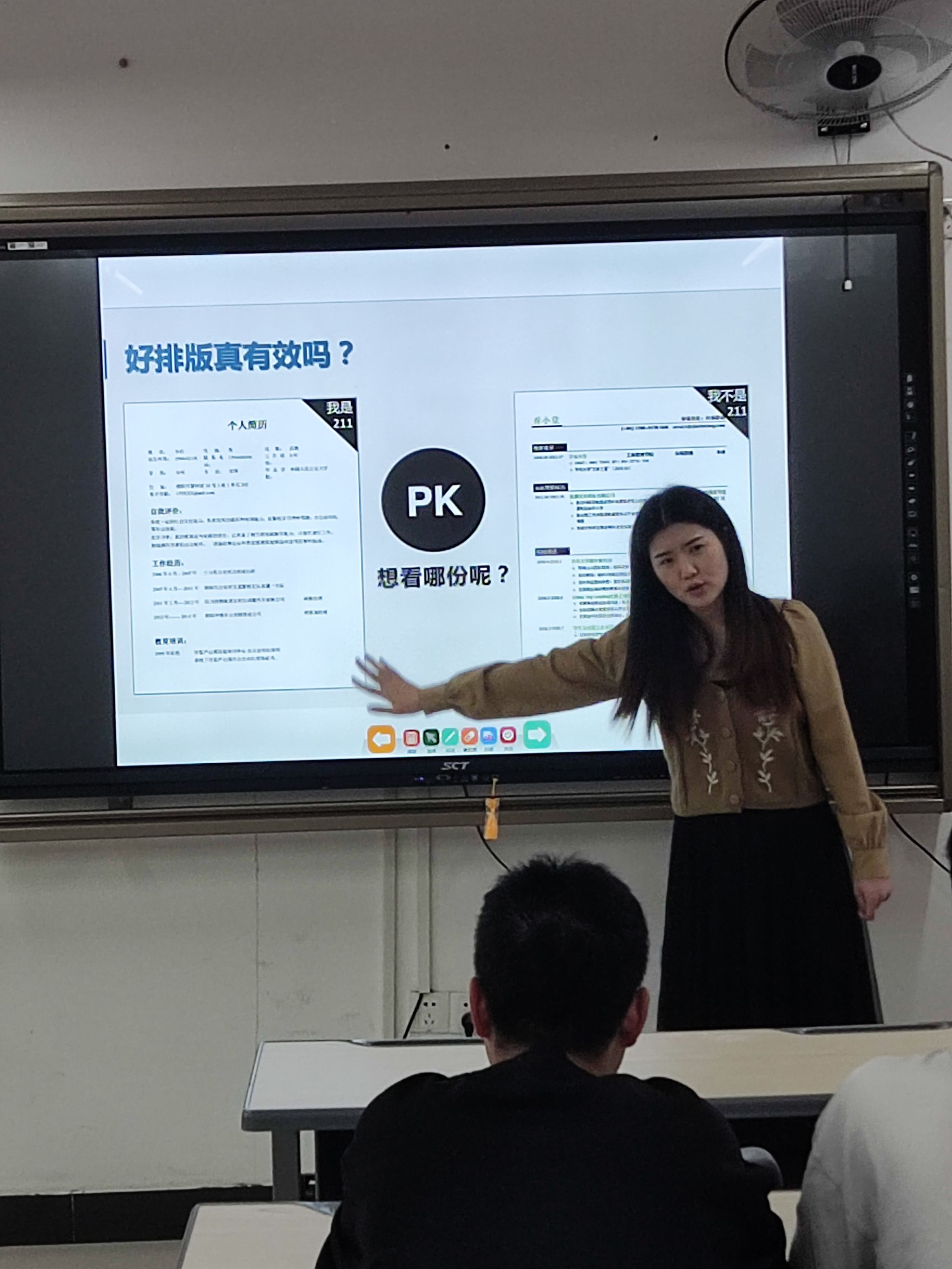 活动结束后廖进老师还让同学们拿上自己的纸质简历,在教室里为同学一一进行悉心指导,让同学们更直观的了解自己简历制作的缺陷,进一步提升同学们制作简历的能力。