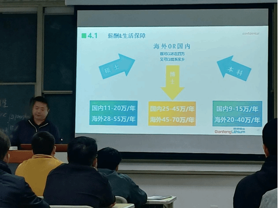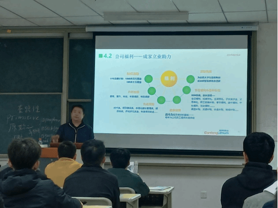 宣讲会上,公司负责人用PPT向毕业生介绍公司的概况、职业发展方向、人员需求,并介绍了企业文化、工作环境,还着重提出了对毕业生设计专项培养计划。通过集中培训,走进赣锋、了解赣锋;通过团队拓展,感受职场、实现蜕变。通过完成任务,改变观念、积累经验。最后介绍了公司的福利待遇和健康问题。各种补贴和奖金应有尽有,每年为公司员工提供年度体检。然后各个毕业生和企业负责人进行了以下交流:公司实习生招聘、企业前景、地域差异等。公司负责人耐心且详细地解答了毕业生的疑惑,给予了毕业生信心。