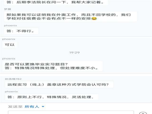会议下半场,学生们逐渐放开,大胆地将心中疑问陆续抛出,特别是即将进行的校外实习方面的问题出现次数最多,刘桃老师耐心回答了这些问题,并对三方协议的签订,实习签到打卡,实习材料的提交,实习成绩的考核指标等内容作出详细讲解。对于因疫情实习受限的同学,刘桃老师指出,结合自身情况灵活就业,特殊情况特殊处理。