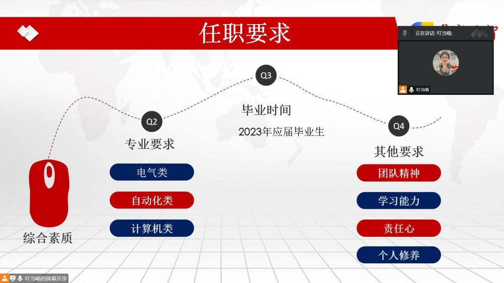 为进一步拓宽毕业生的就业之路,搭建毕业生与用人单位更便捷完善的交流平台,更好地促进2023届毕业生顺利就业,2022年10月12日10:30,智能工程学院引进重庆集成自动化系统有限公司在腾讯会议进行宣讲招聘,80余名2023届毕业生参加了此次直播。