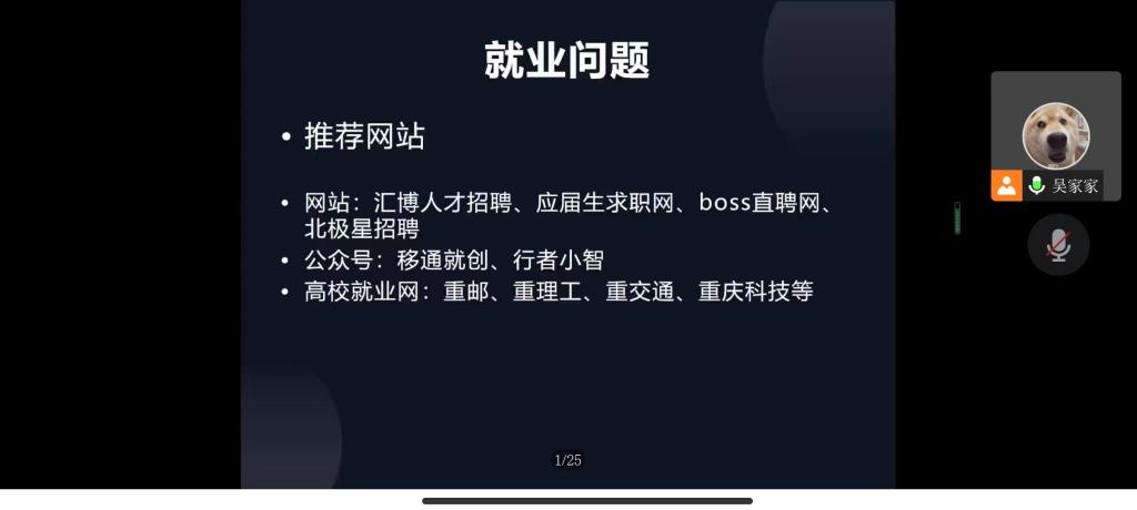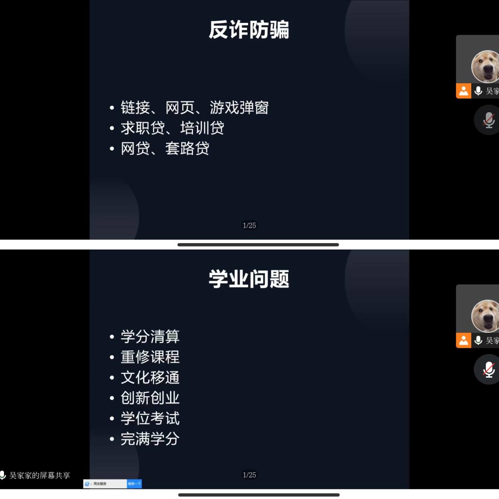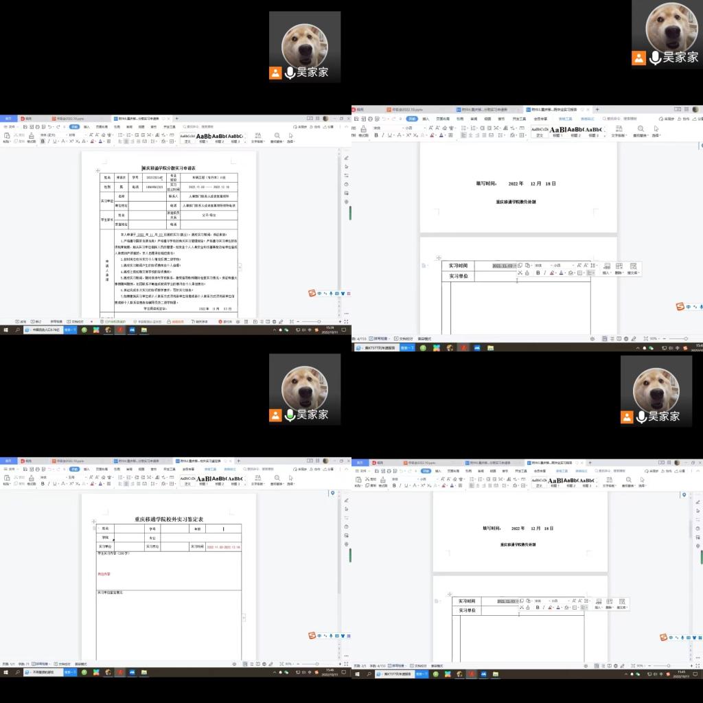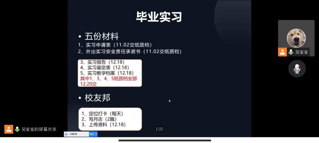 然后,吴老师线上为同学们展示毕业实习材料提交的流程以及相关细节,对于实习申请表中容易出错的地方作出了标注及解释,将实习报告的要求和注意事项一一列出,针对于实习期间所需要用到的“校友邦”软件的使用及注意事项展开说明,展示软件的操作流程,提醒同学们提前做好毕业设计选题等准备。