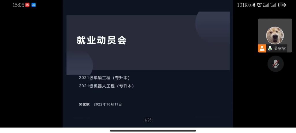 为进一步做好毕业生就业工作,帮助同学们树立正确的就业择业观念,2022年10月11日15:00,智能工程学院辅导员吴家家老师线上开展“职场之路,即可出发”毕业生就业动员大会,参与人员有2021级车辆工程(专升本)、2021级机器人工程(专升本)全体同学。