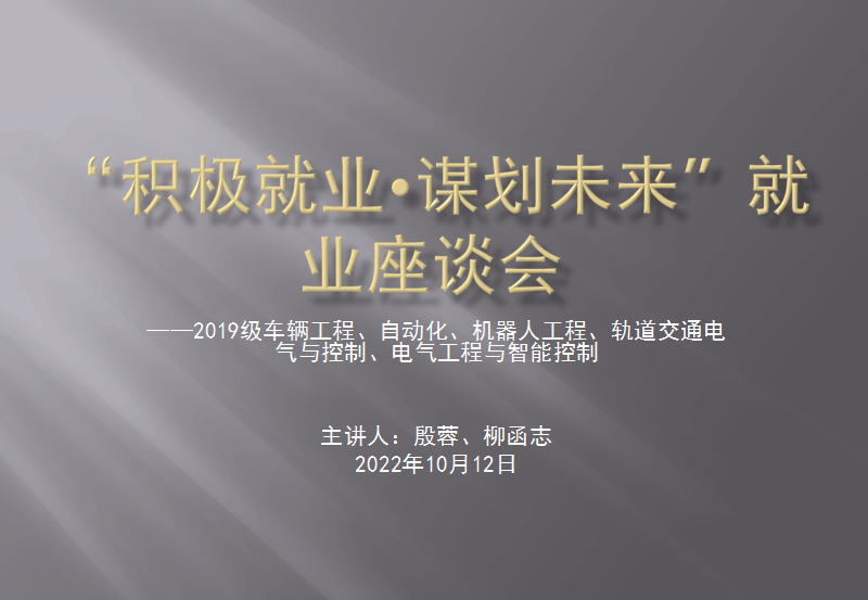为深入落实学校就业工作部署,更好地开展2023届毕业生的考研、就业工作,帮助学生树立信心,毕业班辅导员殷蓉老师于2022年10月以“线上”的方式举办就业座谈会。2019级车辆工程、自动化、机器人工程、轨道交通电气与控制、电气工程与智能控制专业学生参加了本次座谈会。
