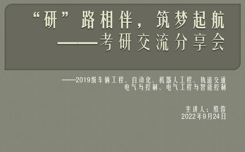 为帮助智能工程学院2019级学子把握考研形势、树立正确的考研观、掌握科学的备考方法、及时做好学业规划,智能工程学院辅导员殷蓉、刘桃于9月召开了2019级车辆工程、自动化、机器人工程、轨道交通电气与控制、电气工程与智能控制专业考研交流分享会。