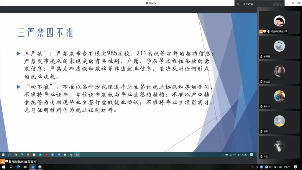 胡慧敏老师强调2022届毕业生就业工作已进入关键时期,并对同学们提出三点期望:一是转变就业观念,树立正确的择业观,适应时代发展的需求;二是做好充分准备,发挥主观能动性,提高自己的综合实力;三是科学利用各种资源,主动寻找就业机会,争取“早就业”“稳就业”。