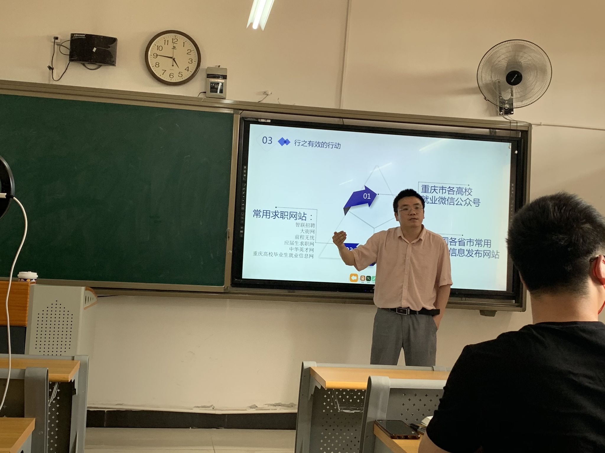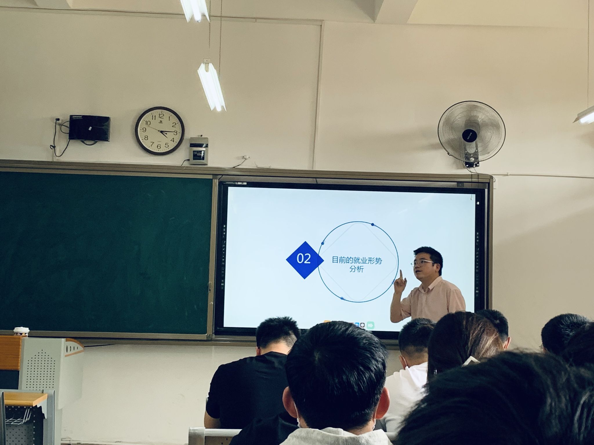 随后我校创新创业导师库成员廖阳老师对即将步入大四的同学们所面临的各项就业问题进行讲解。他指出读书不仅是为了更好的成为自己,同时也是为了更好的就业,紧接着廖阳老师为同学们分析各种就业形势的客观数据,其中包括毕业生竞争形势、全球就业形势、不同行业就业形势。并且针对就业数据作出分析。对于同学们的各种各样的需求,老师提出两个言简意赅的方针——1.学好专业,夯实基础2.及早规划,明确方向。